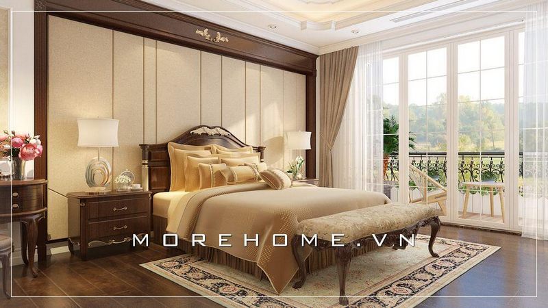 Thiết kế nội thất phòng ngủ biệt thự sang trọng, chiếc giường ngủ tân cổ điển cách điệu, mảng tường đầu giường được trang trí bằng giấy dán tường tân cổ điển tạo điểm nhấn lạ mắt mà không quá đơn điệu