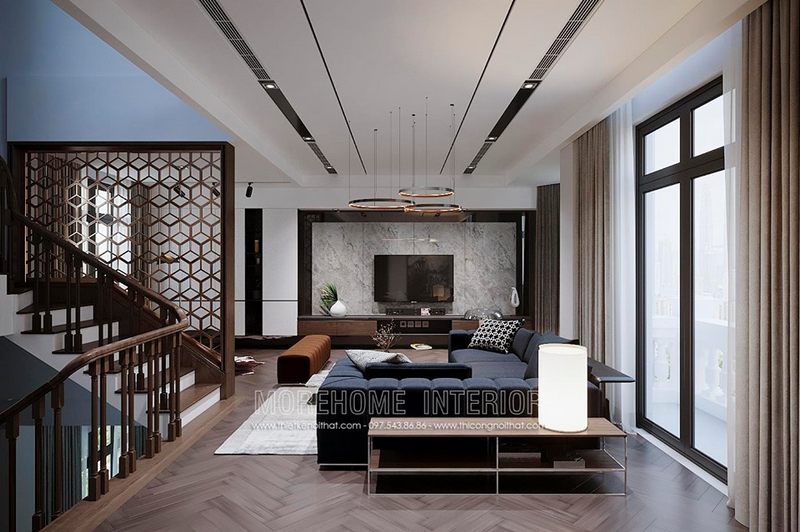 Trang trí nội thất phòng khách hiện đại đẹp, sang trọng tại biệt thự Xuân Phương.