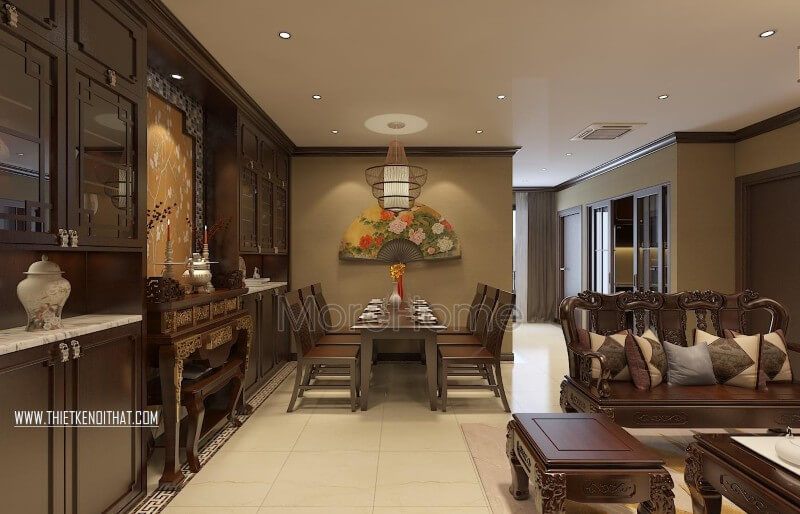 Gỗ óc chó sang trọng kết hợp cùng sắc màu tương phản cùng cách trang trí sẽ tạo nên vẻ đẹp tổng hòa, sang trọng, độc đáo như với ý tưởng thiết kế nội thất phòng khách căn hộ chung cư phong cách Á Đông trên đây.