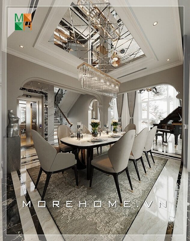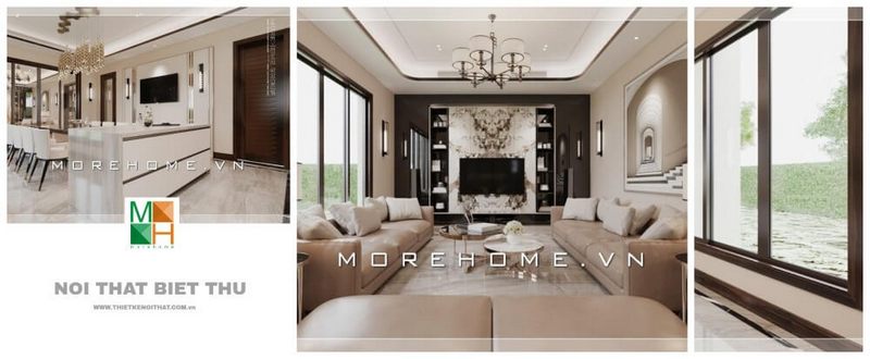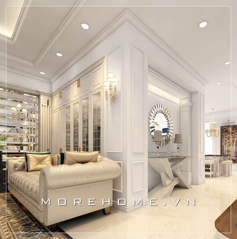 Trang trí nội thất phòng khách biệt thự tân cổ điển nhẹ nhàng, không quá cầu kì vào từng chi tiết nhỏ, tạo nên không gian sang chảnh và thoáng đãng hơn