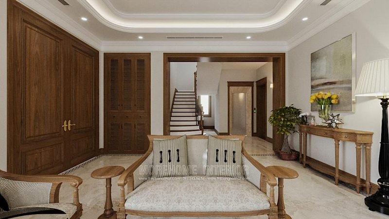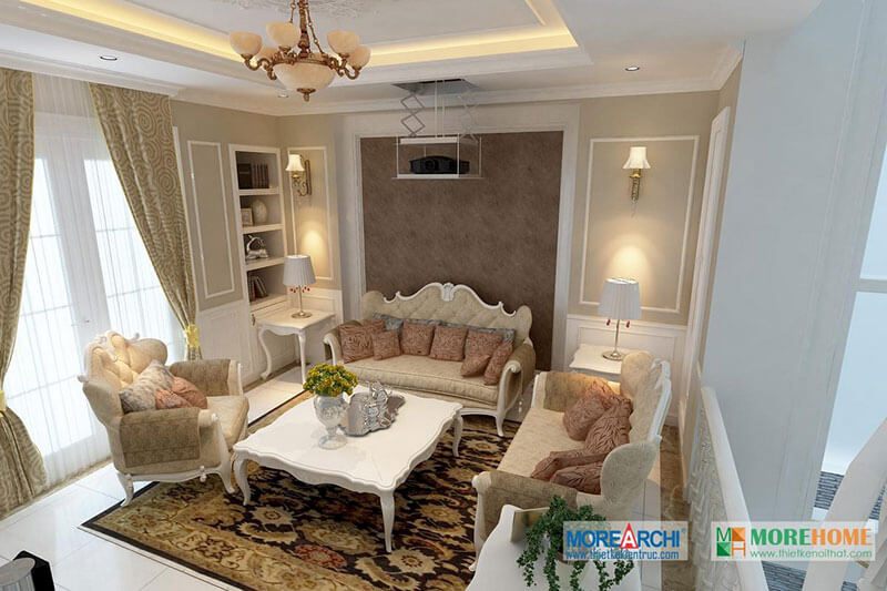 Thiết kế phòng khách nhỏ cho biệt thự theo phong cách tân cổ điển tạo không gian tiếp khách và thư giãn cho các thành viên trong gia đình