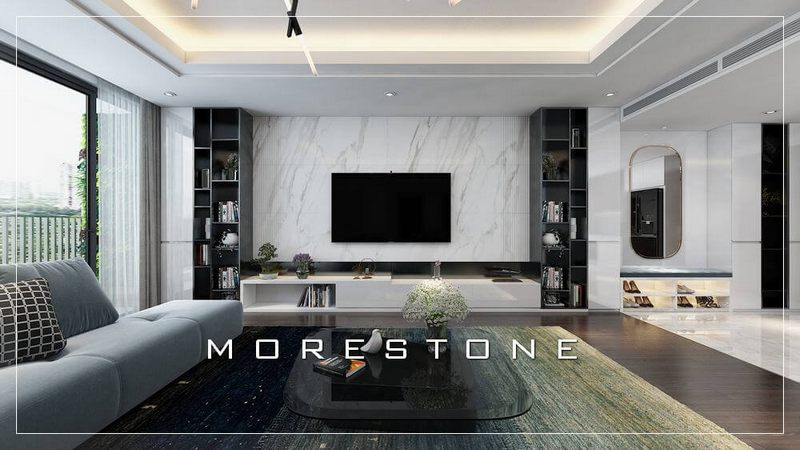 Sử dụng đá ốp tự nhiên màu xám với nhiều đường vân tinh tế cho phòng khách thêm độc đáo là ý tưởng được nhiều khách hàng Morestone lựa chọn trong thời gian gần đây.