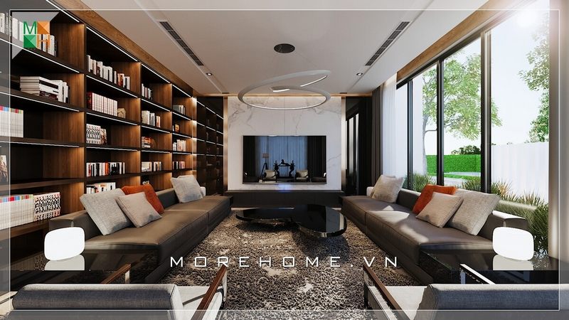 Kệ tủ để sách chạy dài ngăn cách như một vách tường bố trí ở phòng khách của biệt thự, nhà phố vừa sang trọng, vừa tiện nghi.
