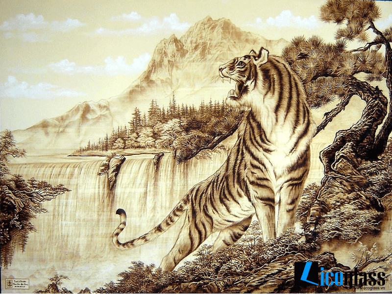 Mẫu thiết kế tranh kính khắc hình Hổ - từ lâu đã được mệnh danh là chúa sơn lâm, chúa tể của rừng rậm. Hình tượng con hổ thể hiện cho sức manh, cho quyền lực và sự oai phong. Tranh hổ thường được treo ở phòng khách hoặc nơi làm việc, giúp xua đuổi vận khí xấu và mang lại may mắn cho gia chủ