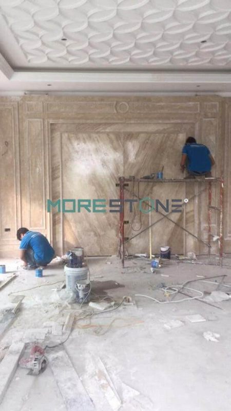 Để hoàn thiện phòng khách của căn biệt thự tân cổ điển, Morestone thi công đá ốp tường tự nhiên có vân đối nhau đem đến sự cao cấp, sang trọng mà thời thượng cho căn phòng.