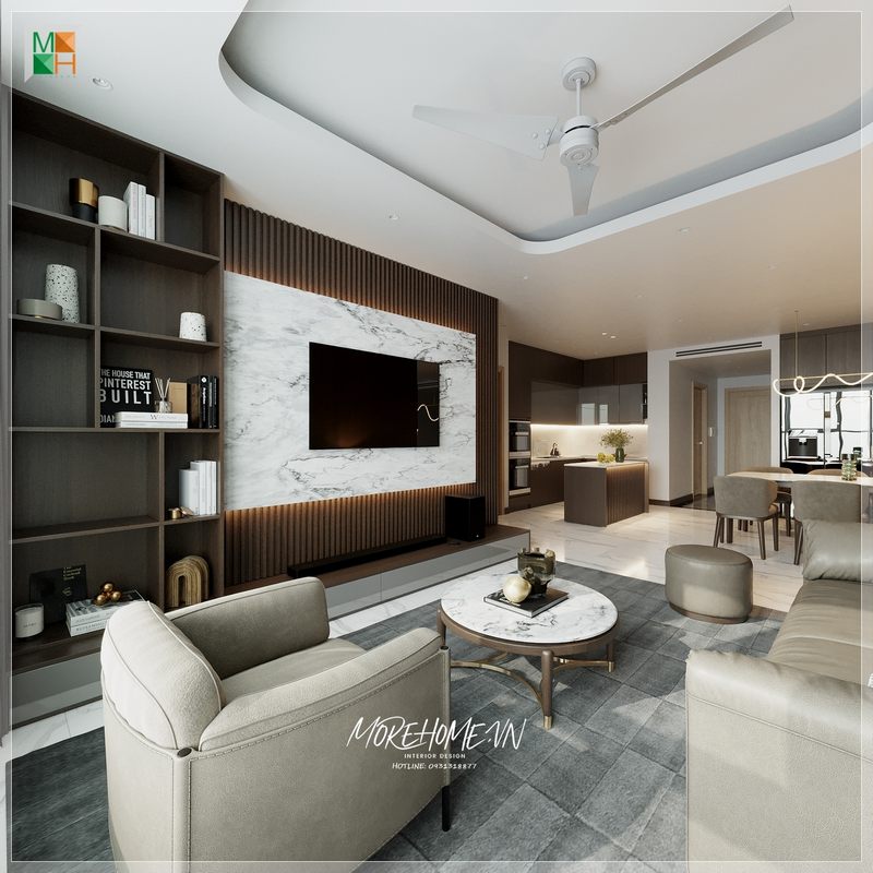 Sự kết hợp giữa đá trắng vân mây, gỗ ốp tường vân óc chó cao cấp mang lại một vẻ đẹp sang trọng và hấp dẫn đến phòng khách hiện đại.